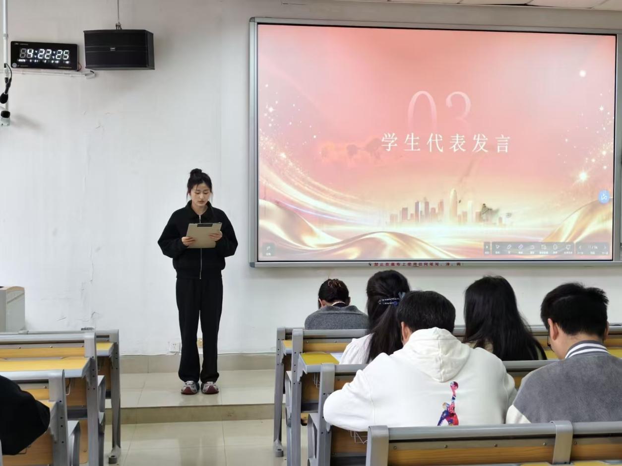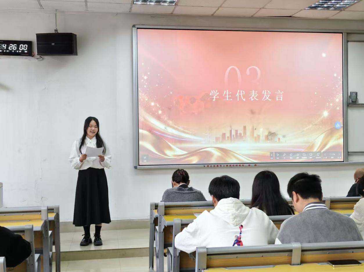在获奖学生代表发言环节,冯佳艺以“专注与坚持”为主题,畅谈高效学习方法,并鼓励大家积极参与竞赛,在持之以恒的努力中提升抗压能力与团队协作精神。熊心心围绕“择热爱、肯坚持,重实干、敢担当”,分享了自己勤学苦练、稳步提升专业成绩的经历,传递“守初心、乐奉献”的成长信念。王盛清聚焦奉献与服务,倡导在服务他人中锤炼自我、带动同学共同进步,以担当实干实现个人价值。