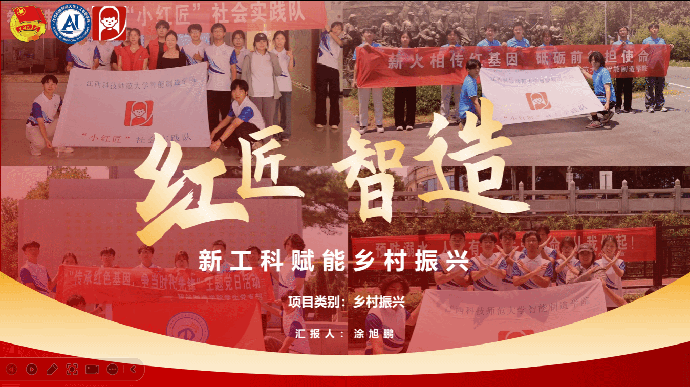 近日,江西科技师范大学第七届青年志愿服务项目大赛决赛圆满落幕。人工智能学院“小红匠”实践队的“红匠智造——新工科赋能乡村振兴实践”项目,凭借与学院特色团学品牌“红匠微课”的深度融合、扎实的实践成效,以二级学院第一名的优异成绩斩获大赛银奖,为学院志愿服务与乡村振兴实践工作再添亮眼成果。